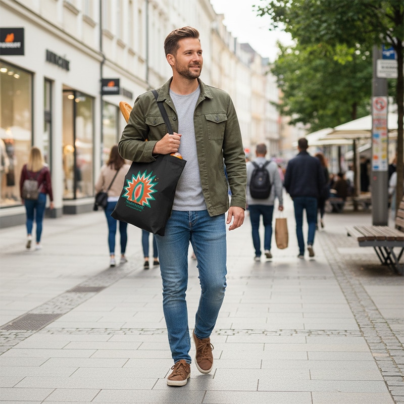 Die Tasche misst rund 38 × 42 cm, fasst etwa 10 Liter und ist mit langen Tragegriffe von etwa 67 cm ausgestattet – sodass sie bequem über der Schulter oder in der Hand getragen werden kann. Ideal für alle, die Wert auf nachhaltige Materialien legen und gleichzeitig eine funktionale, leichte Stofftasche mit Stil und Qualität suchen. Der Muschikraft-Print macht das gute Stück zum stylischen Alltags-Statement.